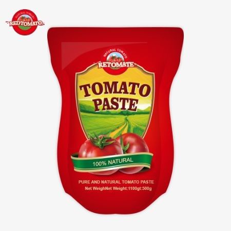 La pasta di pomodori in sacchetto stand-up da 1100 g è un formato di imballaggio popolare, con un sacchetto stand-up con una capacità di 1100 grammi (o 1,1 chilogrammi).