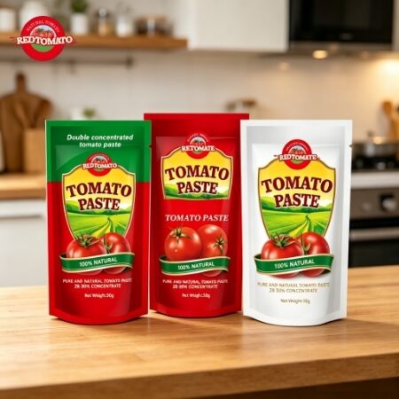 The stand-up sachet design offers a convenient, user-friendly solution for packaging tomato paste. Made from flexible materials, it stands upright for easy storage and handling. Commonly used for 50g portions, it provides just the right amount for cooking without opening a larger container, while maintaining freshness until use.